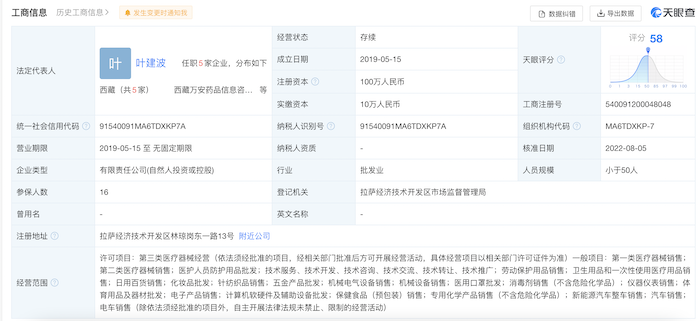 天眼查显示,上述提到的叶建波还是西藏文华医药科技有限公司(下称:西藏文华)的执行董事兼总经理,持有该公司40%的股权。西藏文华成立于2019年5月,注册资本100万,参保人数为16人。