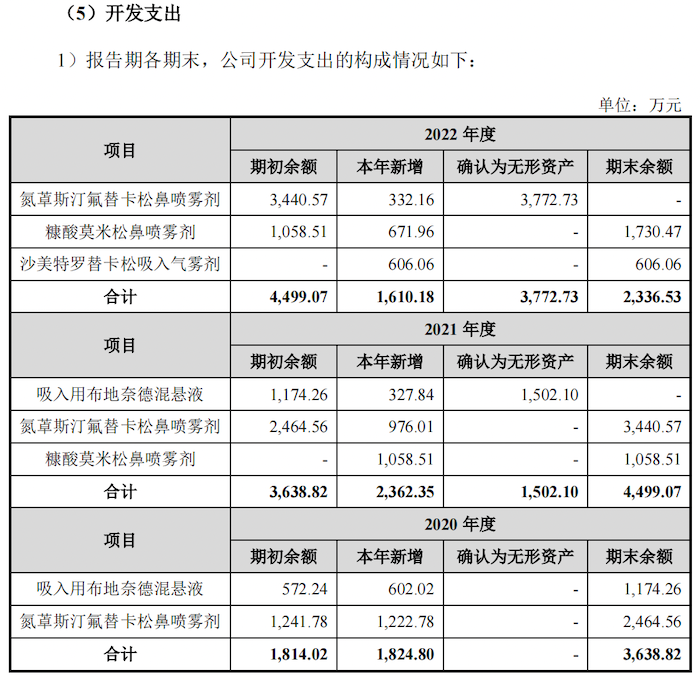 界面新闻记者注意到,长风药业两款已获批上市药品吸入用布地奈德混悬液、氮䓬斯汀氟替卡松鼻喷雾剂相关的研发项目均已计入开发支出,但未见吸入用硫酸沙丁胺醇溶液。据悉,吸入用硫酸沙丁胺醇溶液已于2021年10月获批,时间介于吸入用布地奈德混悬液、氮䓬斯汀氟替卡松鼻喷雾剂之间。