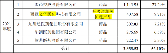 需要指出的是,2021年天风药业同样存在销售呼吸道相关护理产品,对应公司第二大客户——西藏文华医药科技有限公司,销售金额为407.58万元,占主营业务收入的比例为9.71%。