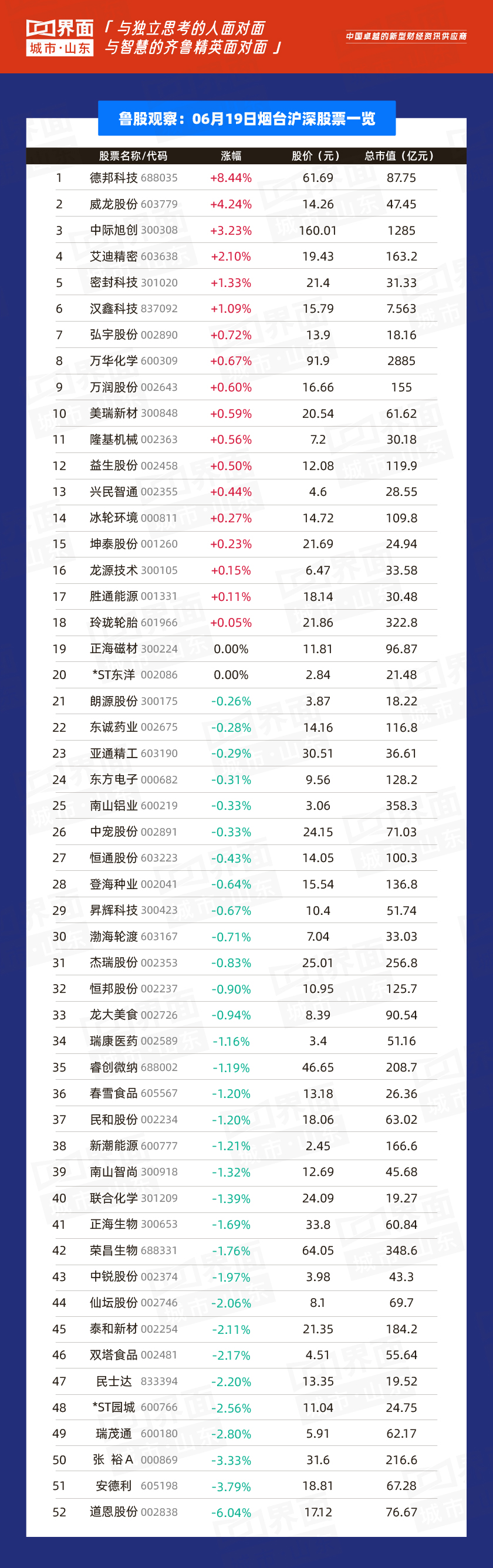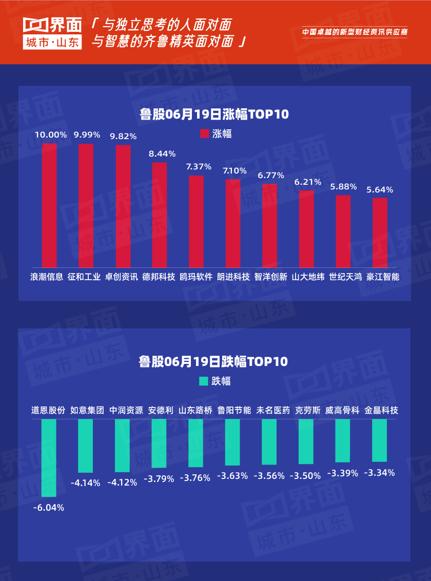 6月19日,山东99只个股上涨,8股持平,191只下跌。