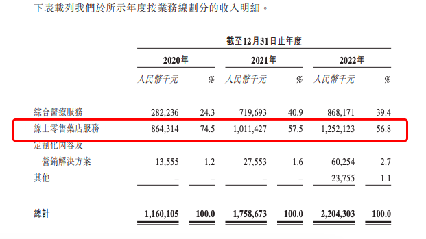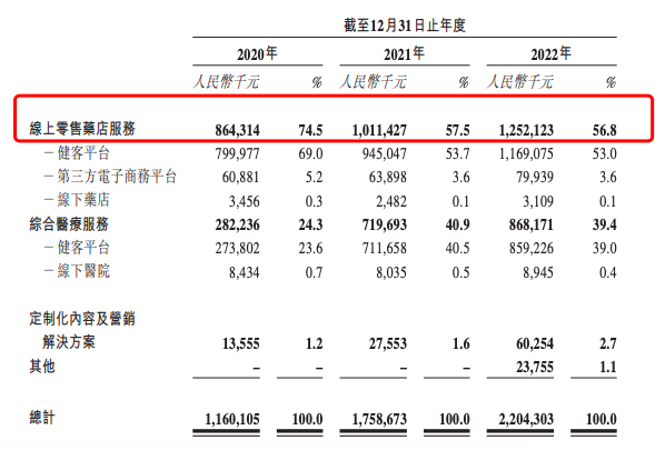 值得一提的是,2022年,方舟云康收入22.04亿元,综合医疗服务占比39.4%,线上零售药店服务占比56.8%,定制化内容及营销解决方案占比2.7%,其他占比1.1%。