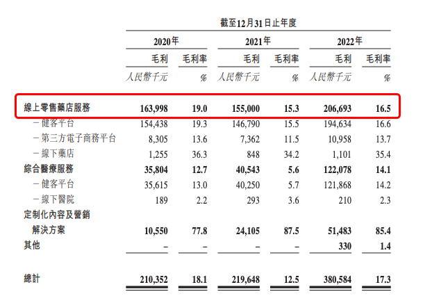 以处方药为主的“卖药”业务,获利空间较小,对于方舟云康的毛利率带来了一定影响。2020年-2022年,方舟云康线上零售药店服务的毛利率分别为19%、15.3%、16.5%。