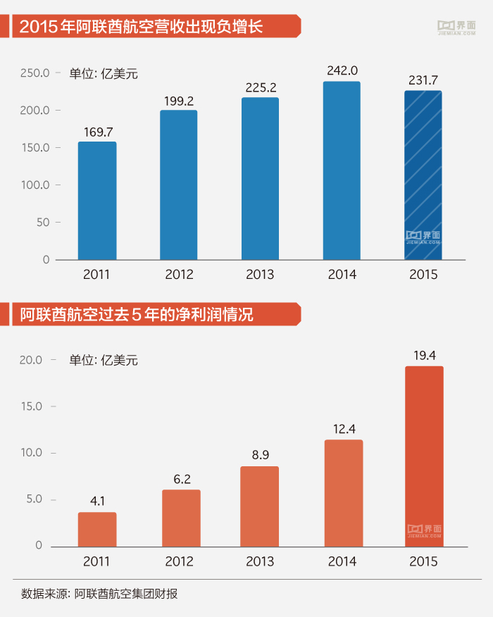 正因为阿联酋航空“连接全球”的策略,将该公司与全球市场捆绑在一起。由此,不管美元汇率、油价波动,还是全球经济变化,或者是重大空难事件,都直接对财务报表产生影响。2015年,因为美元走强和油价原因,阿联酋航空第一次出现营收下降至232亿美元,但净利润仍有22亿美元。