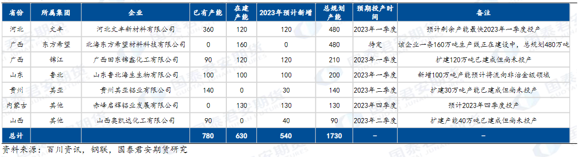 这意味着,国内氧化铝产能已经能够满足未来电解铝的生产需求,甚至已过剩超过千万吨。按照国内氧化铝新增产能项目规划,2023年及以后规划产能共计约1730万吨,且大部分投产时间集中于2023年。