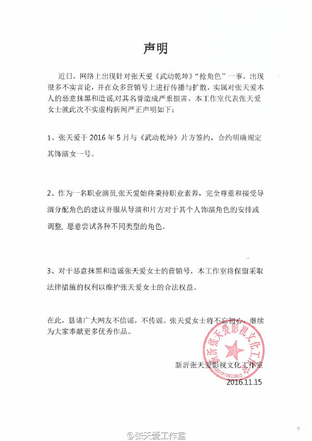 有关热门IP改编剧《武动乾坤》开机前换角一事,张天爱工作室在15日发表声明称,与片方一开始签的就是实验女一号,并且威胁要对肆意抹黑和造谣的营销号追责。