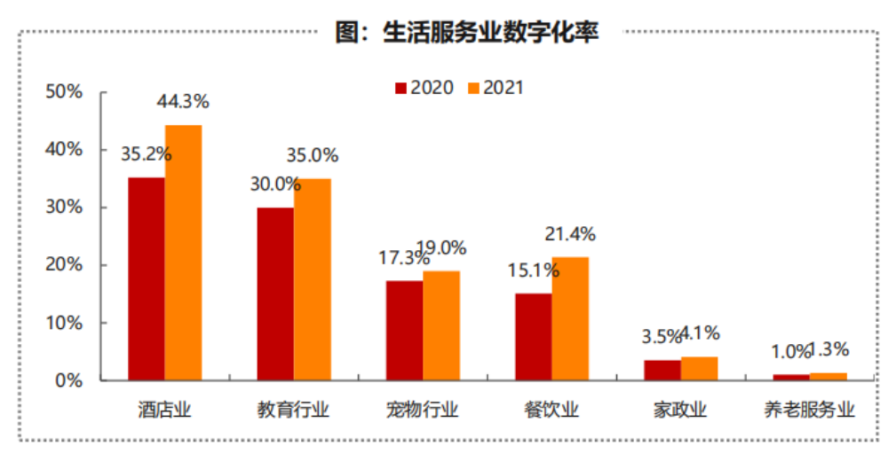 但与之相对的则是,基于本地生活电商杂、乱、多的特点,本地生活电商虽运营多年,但目前不少业态的渗透率依然偏低。据浙商证券的数据显示,2021年家政业、养老服务业的数字化率分别为4.1%和3%,仍处在偏低水平。