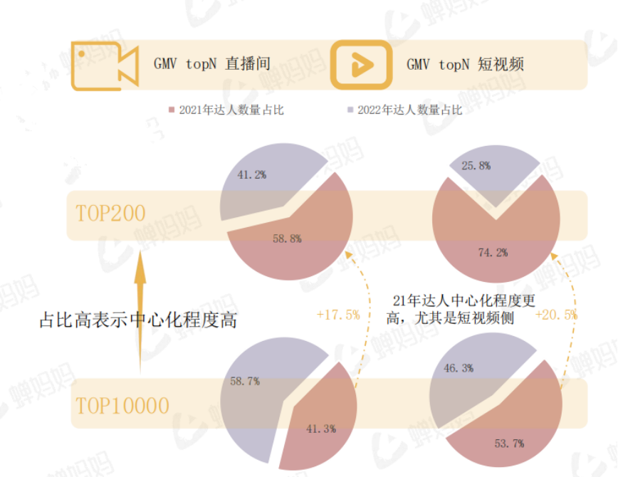 之后平台为避免被头部主播所钳制,开始逐渐去中心化流量,并引入大量头部主播。与此同时,商家端和MCN端也会向平台输送大量的中腰部主播和小主播,最终让平台形成“全民带货”的局面。当前抖音和淘宝直播,均是在走这一路线。