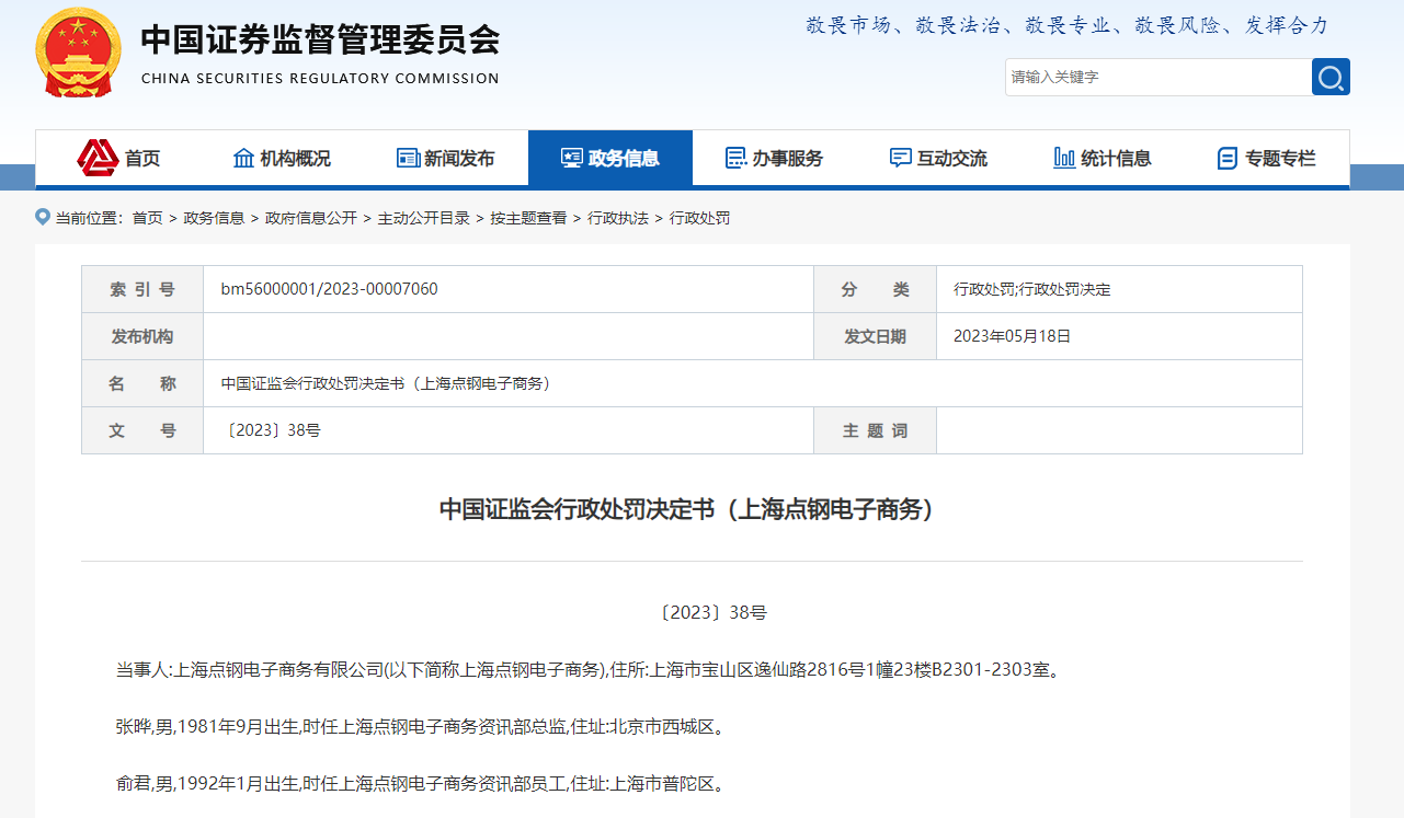 根据行政处罚决定书,证监会决定对上海点钢电子商务给予警告,并对该公司处以30万元罚款,对张晔、俞君分别给予警告并处以5万元罚款。