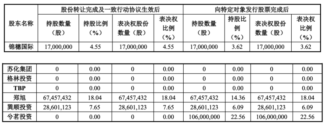 若上述股份转让、一致行动、定增事项最终达成,郑旭、巽顺投资、兮茗投资将分别持有蓝丰生化14.36%、6.09%、22.56%股份,郑旭及其一致行动人合计持有公司股票增加至2.02亿股,占发行股份后公司总股本的43.01%。