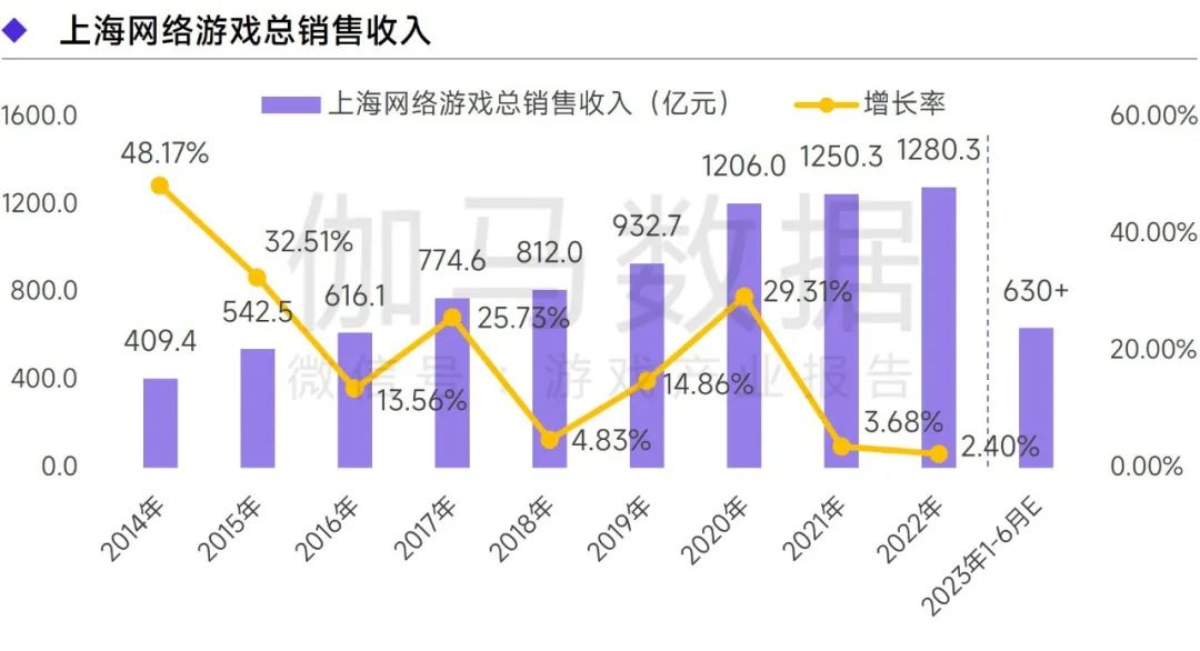 2022年上海网络游戏总销售收入达1280.3亿元,同比增长2.40%,2023年上半年预计超630亿元