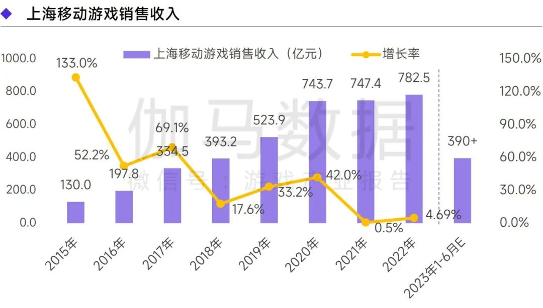 2022年上海移动游戏销售收入达782.5亿元,同比增长4.69%,上海整体游戏收入的增量也主要由移动游戏贡献。