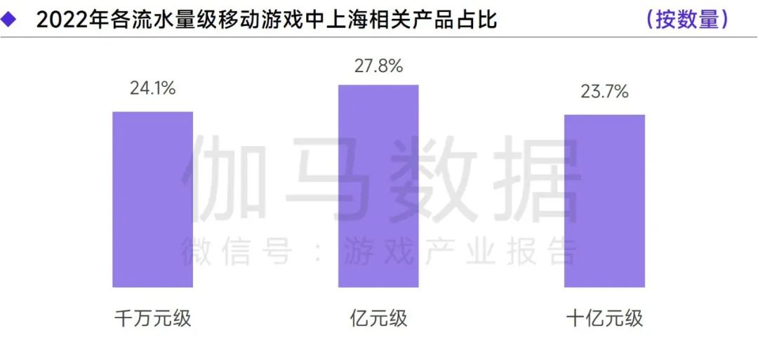 上海移动游戏呈现出“对比全国具备优势,且不同层级产品均具备优势”的特征。数据方面,2022年流水达千万元级、亿元级、十亿元级的产品中,上海相关产品分别占据24.1%、27.8%、23.7%的市场份额。