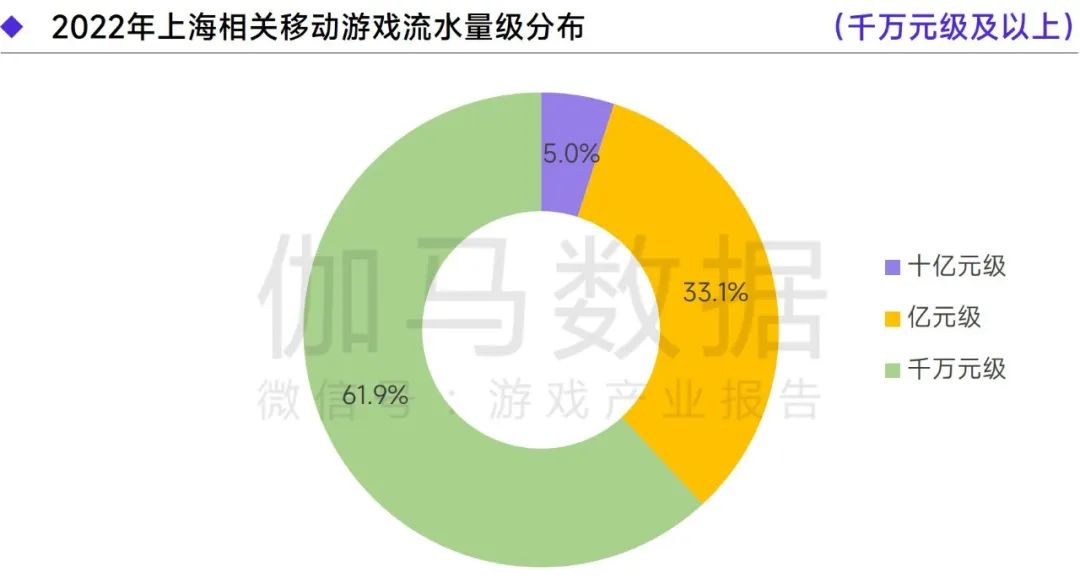 上海地区流水千万元级、亿元级、十亿元级产品数量占比分别为61.9%、33.1%、5.0%,各流水级别产品数量依次递减,与中国移动游戏领域的产品结构相似。