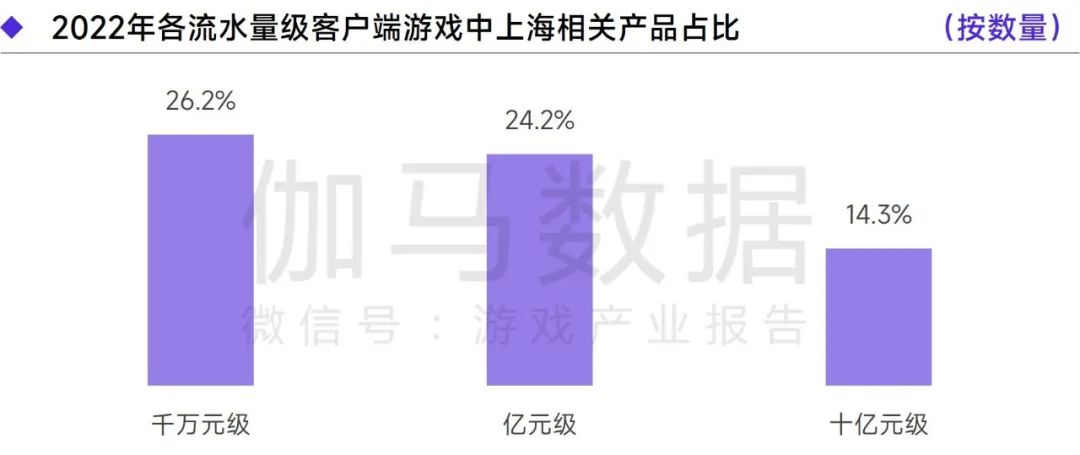 2022年流水达千万元级、亿元级、十亿元级的客户端游戏中,上海相关产品分别占26.2%、24.2%、14.3%。