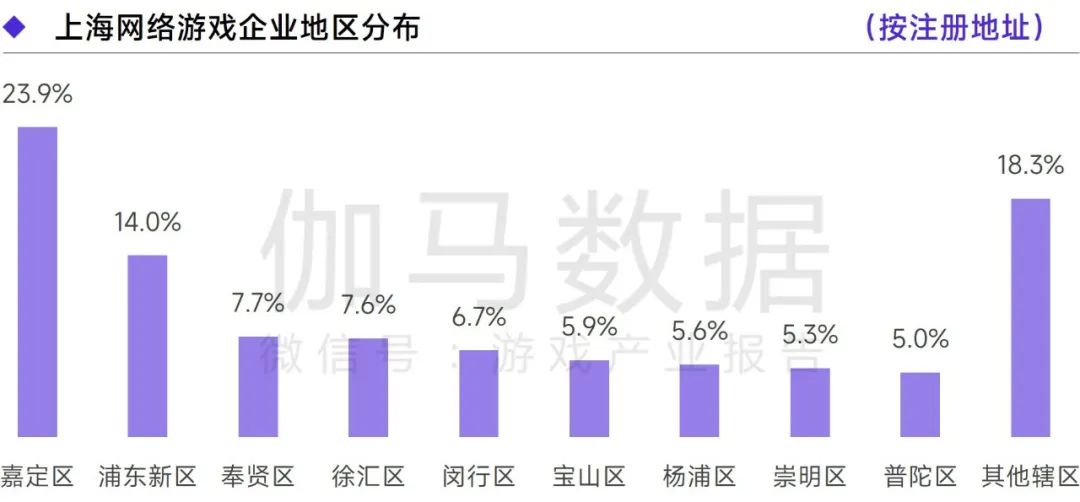 企业表现:上海游戏企业注册辖区,嘉定区占23.9%浦东新区占14.0%
