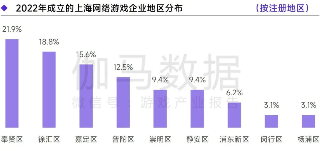 2022年成立的上海网络游戏企业中,合计有56.3%的企业选址在奉贤区、徐汇区、嘉定区。配套服务较佳是上述辖区吸引企业入驻的原因之一,部分企业地址位于嘉定工业区经济城、国家高新技术产业开发区。