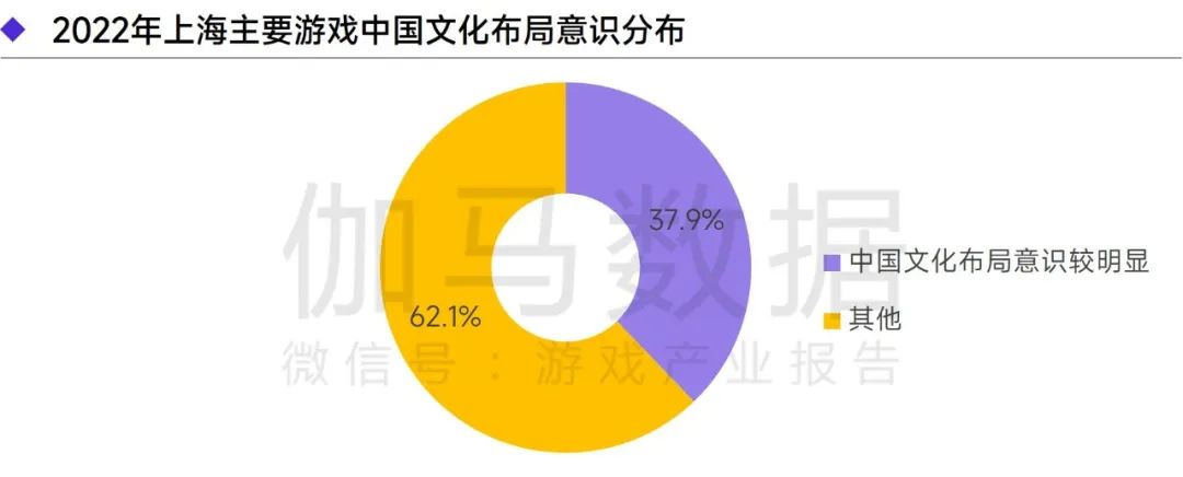 上海主要游戏中62.1%的中国文化布局意识尚不明显,这部分产品中,部分由海外企业研发,上海企业仅参与运营,因此中国文化传播能力较弱;此外,也有部分产品基于起源于海外的IP研发,融入中国文化的难度相对较高。
