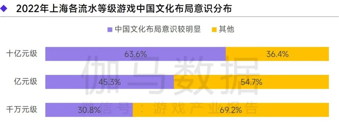 上海游戏产业的中国文化布局意识较强。布局意识一方面体现在布局产品比重上,2022年上海主要游戏中近4成的布局已较为明显;另一方面,文化布局受到头部企业、头部产品重视,流水达十亿元级别产品的布局占比63.6%,显著高于其他级别产品。
