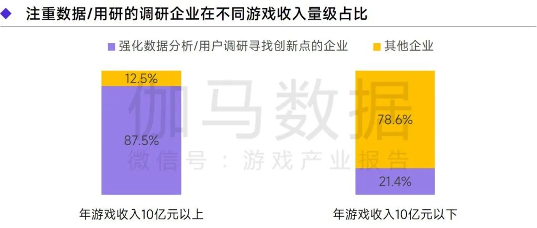 注2:注重数据/用研指在调研题目“面向游戏创新,贵公司近年主要采取了下列哪些方法?”中选择“强化数据分析/用户调研寻找创新点”的企业。