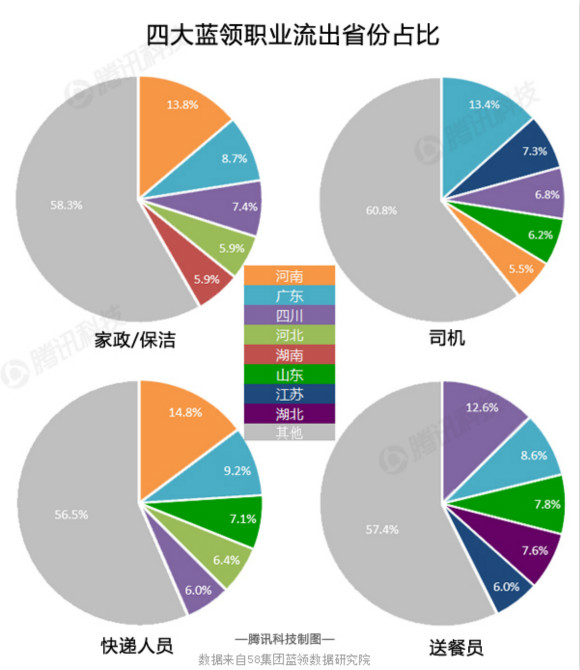 新一轮移动互联网浪潮后,人口最多的河南人,依然是劳动力输出大省。生活服务平台58集团提供给腾讯科技的数据显示,新增互联网+职位中,河南籍就业者在家政保洁和快递员中比重,分别是13.8%和14.8%,位居第一;在司机中排名第五。
