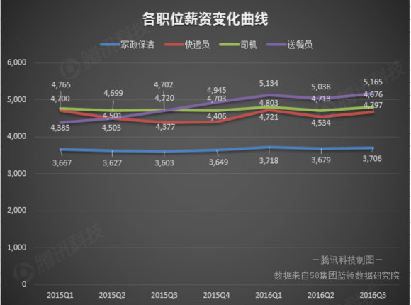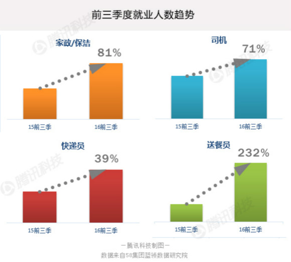 58集团提供给腾讯科技的资料显示,2016年前三季度司机、家政保洁、快递和送餐员等被互联网加持的职位成为求职者增长最为迅速的行业,其中在2016年成为最新热点的送餐员增长最快,同比增长达232.6%。第三季度,送餐员平均薪水超过5000元,与去年同期相比,涨幅约为10%。