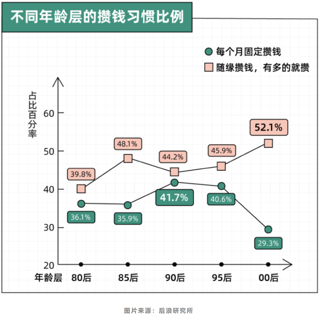 在小红书上搜索“存钱”,有122万篇+的笔记在分享和记录存钱经验,还有不少人因为每日打卡存钱记录而拥有了数万粉丝,被称为“存钱博主”。与过去对90后、95后即时享乐的刻板印象不同,对于存钱,这一届年轻人是认真的。在后浪研究所的《2022年轻人攒钱报告》中提到,超过85%的90后、95后每月都会攒钱,且每月固定攒钱的比例超过40%,超过其他年龄段。