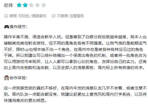 此外,在上线前的“策划面对面”,也说明对半缩减等级提升的数值成长,让新玩家的1级英雄也能应对老玩家的满级英雄。不过从体验来看,匹配不平衡仍旧存在一些问题。因为保留老玩家测试数据存档,游戏存在一轮被压制后,便进入人机比赛,再进入可能被压制的冰火两重天体验中。或许因为一些体验问题,游戏评分也从8.1分滑落至6.1。相关负面评论主要集中在角色获取养成较随机、匹配不平衡和合作体验欠佳上。
