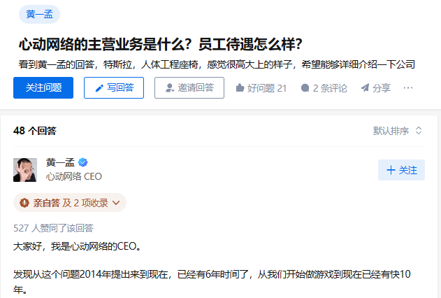 在2014年建立的知乎问题中,“心动网络的主营业务是什么?员工待遇怎么样?”曾有员工阐述“996、管理不透明等”问题。2020年,黄一孟突然降落回答,阐述了心动践行“只雇成年人”、“薪酬将做到游戏行业最高”的观点。在同年,心动设立高薪无项目奖金、半年离职致意金、无限制假期、不签署竞业协议等理想化规定也引起行业热议。