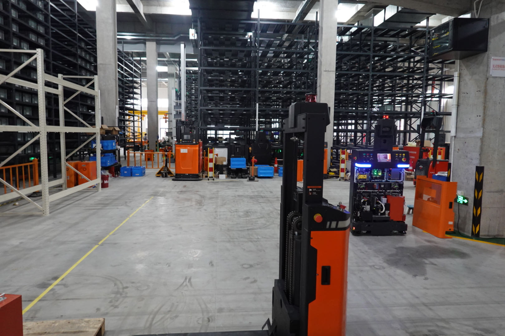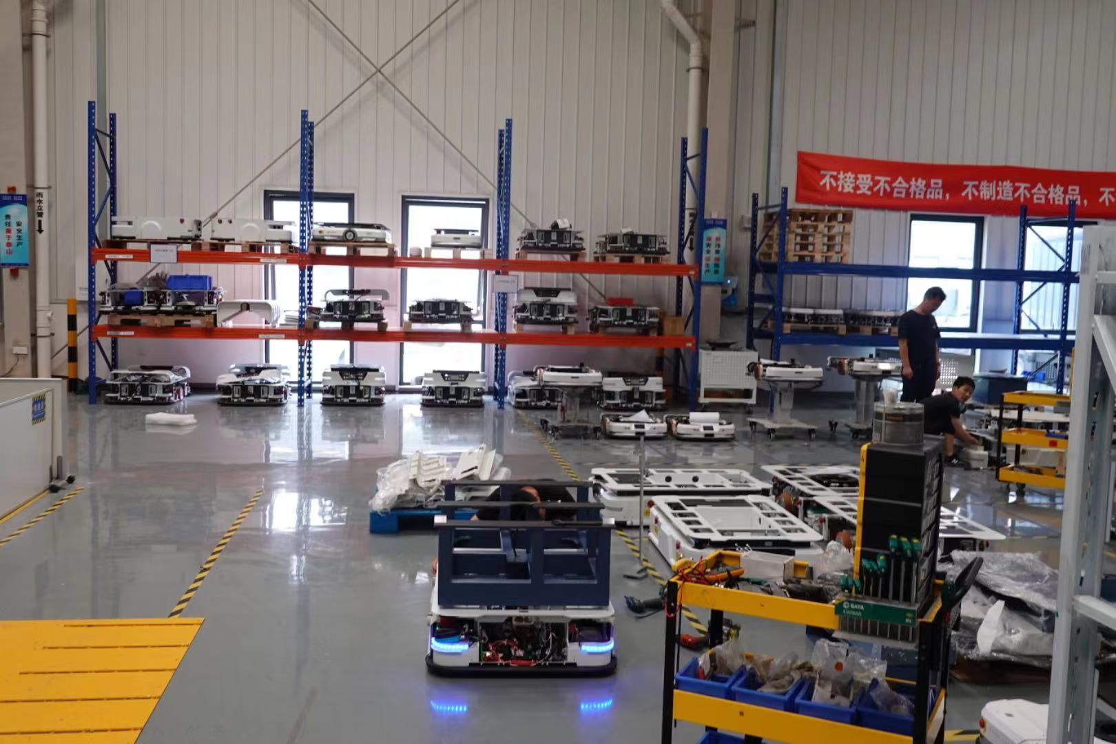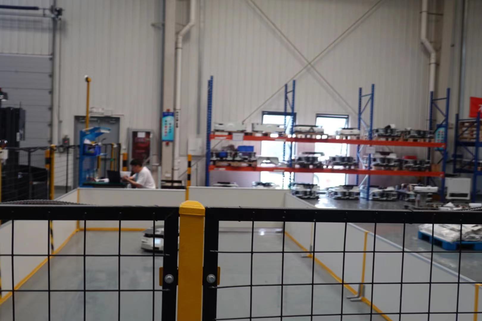 走进斯坦德机器的人安全标准测试中心内部,厂房内分测试、装配、仓库与充电、搬运四大区域,仅有装配线、测试线上需要固定数量的人力支持。有一位工程师在用笔记本电脑一遍遍重复模拟测试着机器人的移动轨迹,还有三两工程师正对着一台原型机围坐讨论工程细节,更多的叉车机器人、移动机器人穿梭其间。