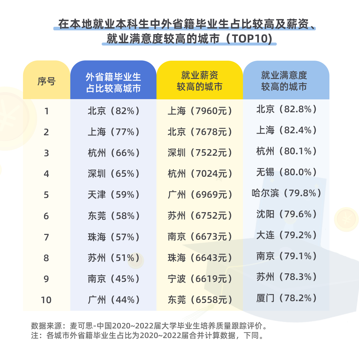 在北京、上海就业的本科生中,主力为外省籍毕业生,2020-2022三届合并占比分别为82%、77%。