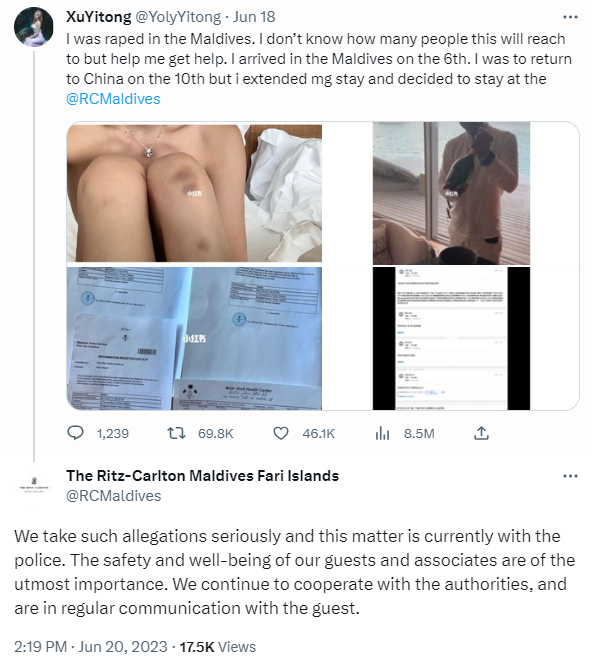 北京时间6月20日下午,涉事的马尔代夫法里群岛丽思卡尔顿酒店在社交平台上回应该中国女游客称:“我们严肃对待此类指控,目前此事已由警方介入处理。客人和伙伴的安全与福祉对我们至关重要。我们将继续同当局合作,并与旅客保持定期沟通。”