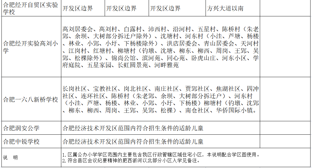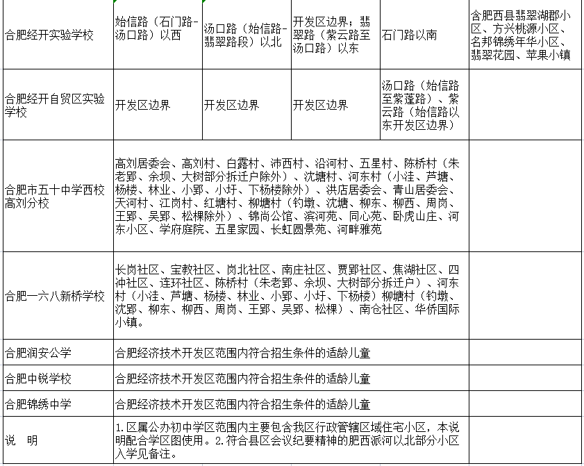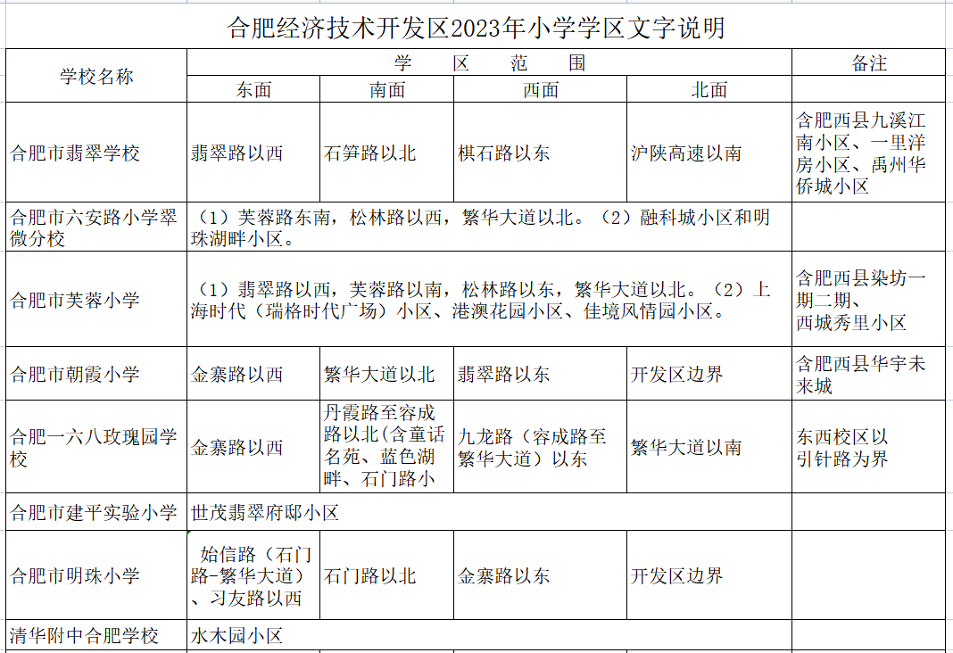 1.合肥市梦园小学教育集团天柱路学校:长江西路以南,西二环路以西,黄山路以北,玉兰大道以东(含环东小区高新区部分,不含蓝鼎海棠湾和烟厂宿舍小区)。