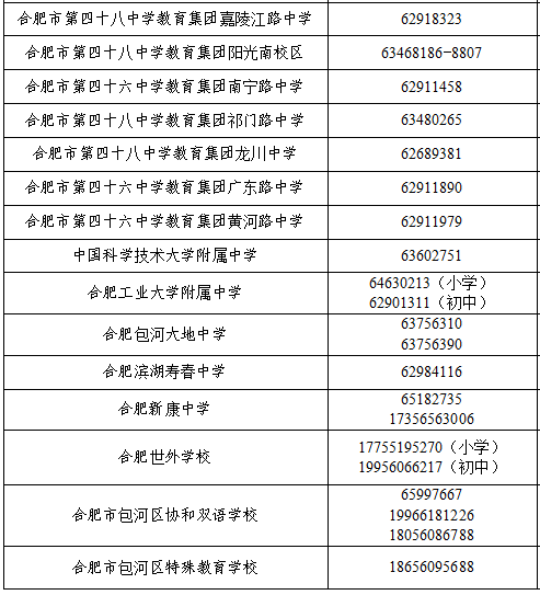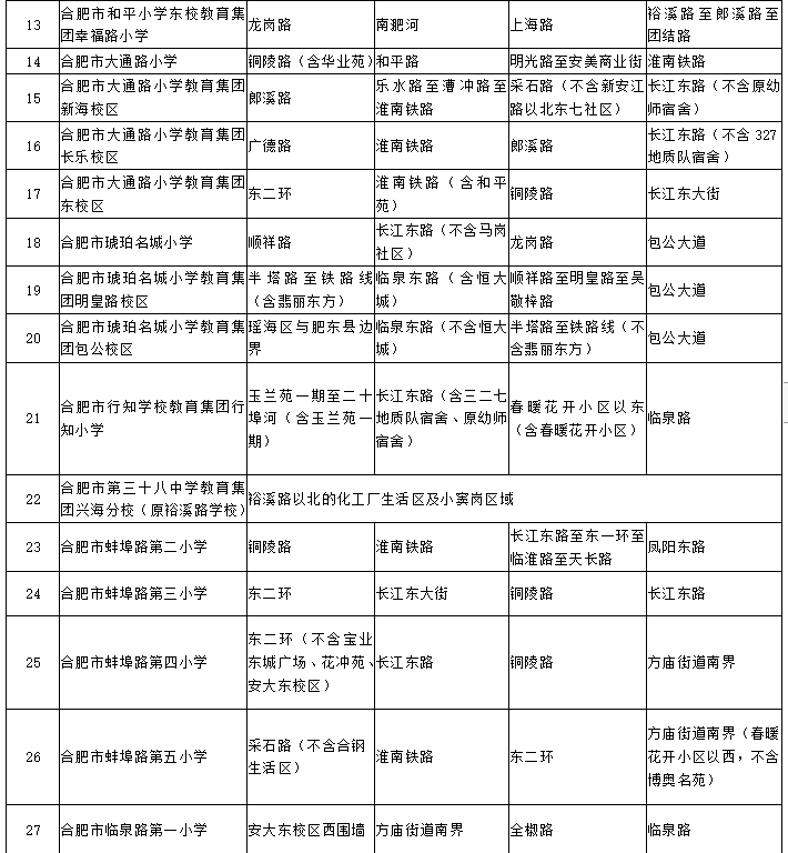 13.合肥实验学校教育集团包河花园校区:天津路以西,繁华大道以北,包河大道以东,高速公路以南。含格林丽景、国开公馆等。