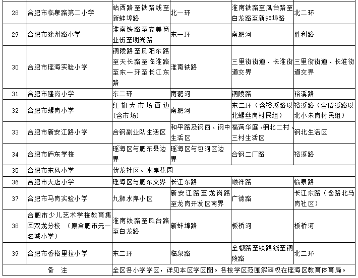 39.合肥市师范附属第二小学:天山路以西,紫云路以北,徽州大道以东,锦绣大道以南。含徽贵苑、春融苑、琼林苑、临滨苑、振徽苑、福徽苑等。