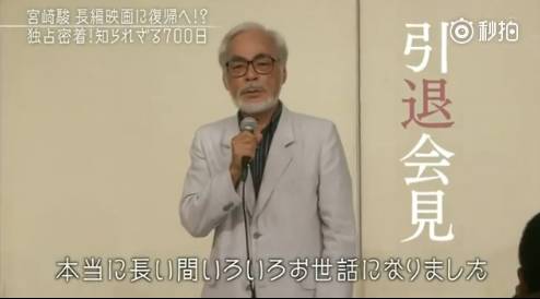 在当天的引退会上,宫崎骏一上台就说:“这次我是认真的。”他也吐槽了自己的出尔反尔:“我自身分裂严重,一边叫着要洗手不干,一边却又投入新的影片创作中。”