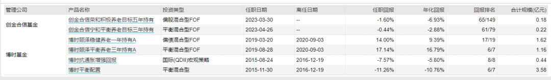 梳理魏凤春所管产品业绩,其中,创金合信荣和积极养老目标五年持有任职回报-1.6%,规模1800万元;创金合信宁和平衡养老目标三年持有任职回报-0.44%,规模2200万元。