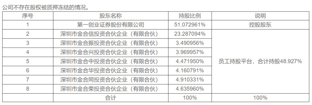 大股东第一创业证券股份有限公司(下称“第一创业证券”)持股51%,为控股股东。此外,以总经理苏彦祝为代表的公司员工,通过深圳市合信投资合伙企业(有限合伙)等平台合计持股49%。