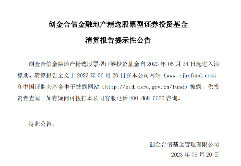 6月20日,创金合信基金旗下两只产品,分别为创金合信金融地产精选、创金合信研究精选发布了进入清算期的提示性公告。这也是今年来创金合信基金唯二清盘的两只产品。