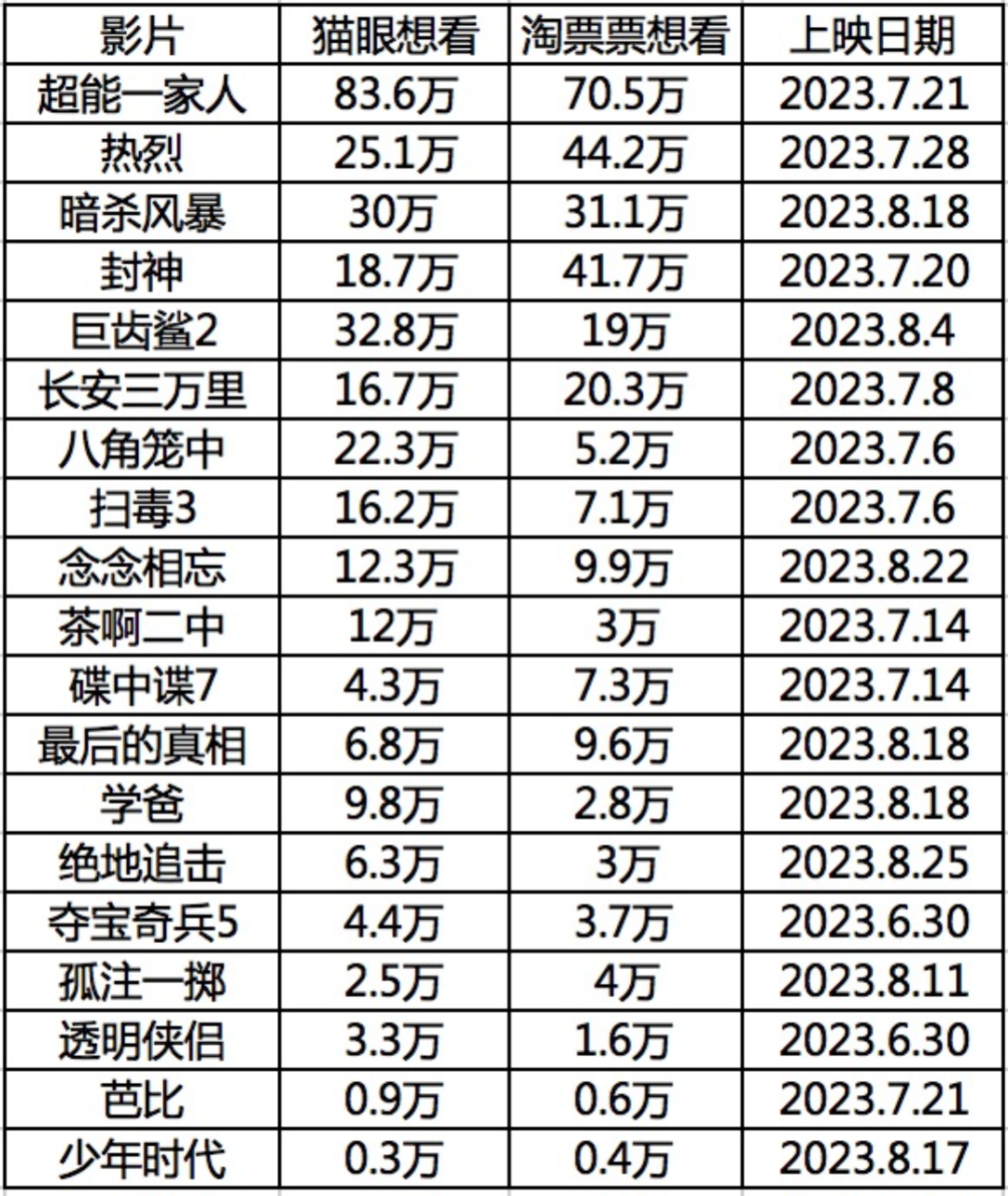 作为头部大片,开心麻花的《超能一家人》;乌尔善的《封神》;吴京、杰森斯坦森领衔的《巨齿鲨2》;黄渤、王一博主演的《热烈》,以上4部,不论是热度上,想看人数上,都处于第一梯队,这些影片无疑是整个暑期档的基础,是决定市场下限的压舱石,有着定海神针的作用。