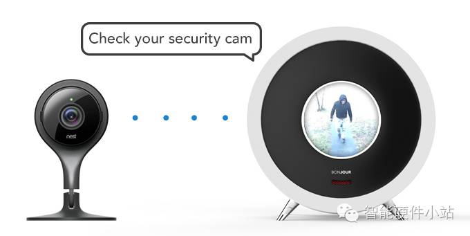 又比如,有强迫症的你睡前总要去检查家里的门栓有没有锁好,有了Bonjour,你可以教它在你说“晚安”之后,对你的家的安全做一个安全例行检查。如果车库门仍然打开或者是大门没锁,它会提醒你去关好。Bonjour还能够通过WiFi连接到摄像头,并在它的屏幕上显示摄像头拍摄的内容。