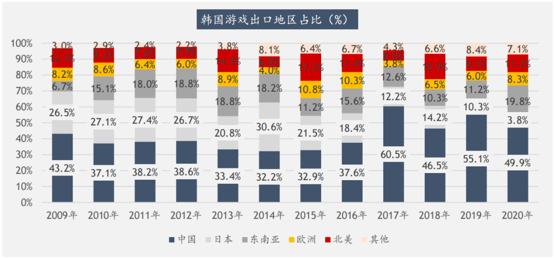韩国游戏产业2000后开启全球化步伐,2020年游戏出口总额达到81.94亿美元,2013年之前出口额度甚至领先于中国,2020年出口额度也达到中国的53%。