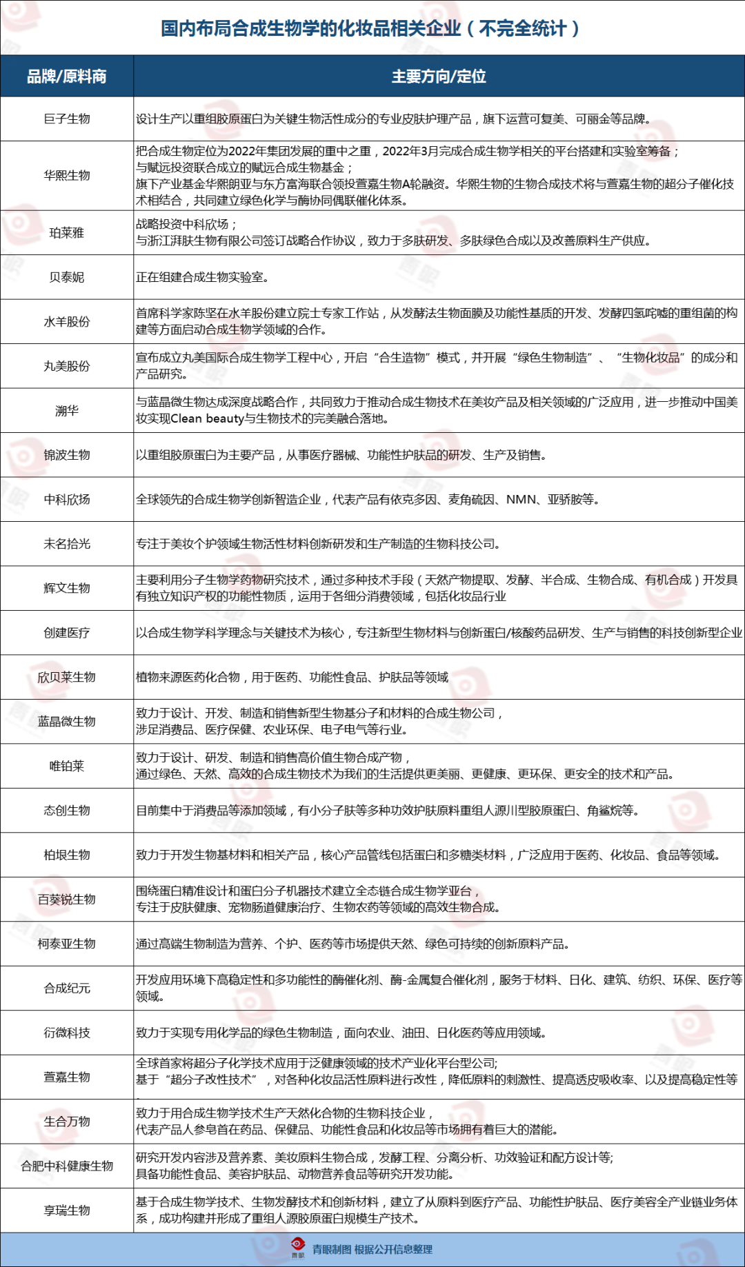 此外,诸如珀莱雅、贝泰妮、水羊股份等头部美妆上市企业也都在通过投资、组建合成生物实验室、引入科学家等方式入局合成生物学技术应用领域。