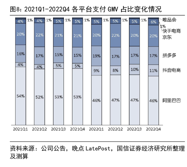 近几年,阿里巴巴电商业务市场份额的下滑速度惊人。早年,阿里曾占据着80%以上的电商市场份额,然而,据国信证券研报显示,2021年第一季度阿里巴巴的GMV占比仅有54%,到了2022年第四季度,这个数字降到了46%。