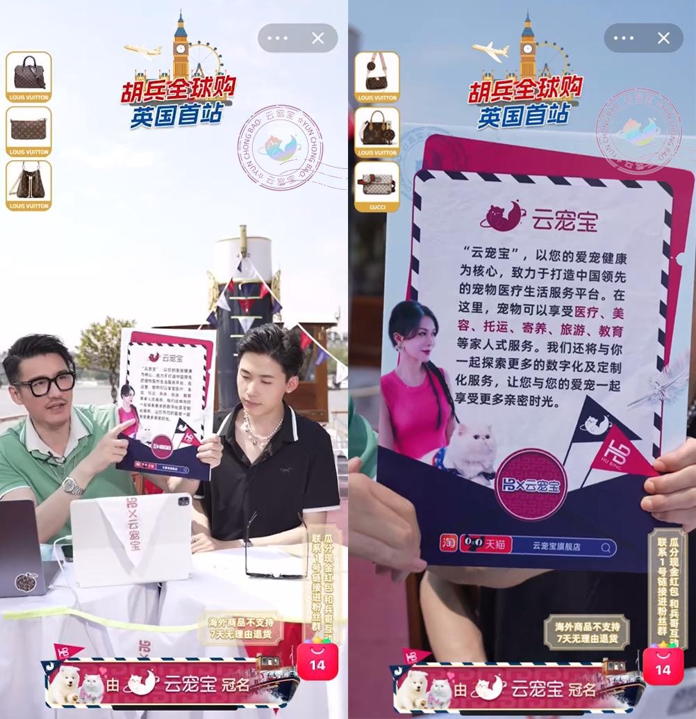 6月11日,云宠宝独家冠名的胡兵全球GO·天猫直播,首站于英国伦敦泰晤士河游艇爱德华号开播。“英国直播”、“时尚游艇”、“首位伦敦时装周全球代言人胡兵”众多关键词让此次直播成为了618直播行列中最为特别的一个,上线后便迅速吸引了观众的眼球。这场携宠云游欧洲的游艇直播,开创国内外双线直播先河,带来直播行业的全新体验。