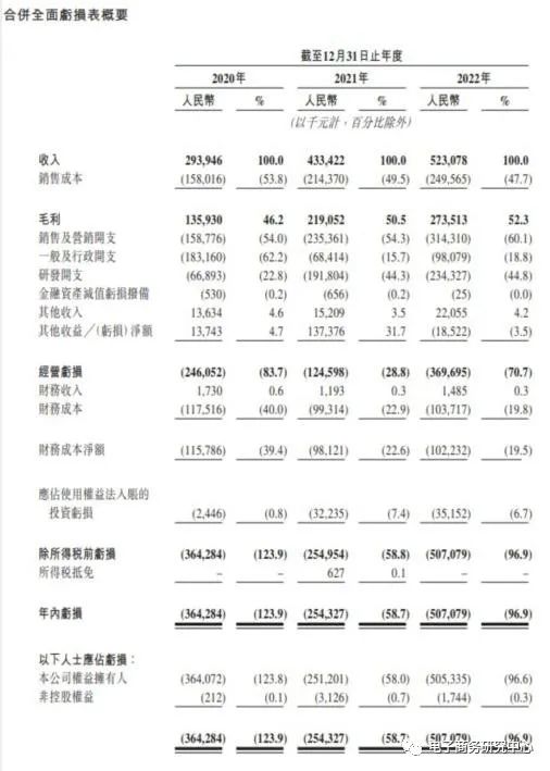 招股书显示,2020-2022年,聚水潭实现收入分别约为 2.94 亿元、4.33 亿元以及 5.23 亿元人民币;年内亏损分别约为3.64 亿元,2.54 亿元以及 5.07 亿元,三年亏损11.25亿元。