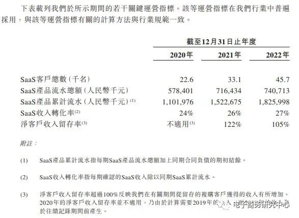 随着公司客户群的增长及流水的增加,客户的预付款项随后于合同期内或于消费时在公司的收入内确认。于2020年、2021年及2022年,公司的SaaS收入转化率分别为24%、26%及27%。