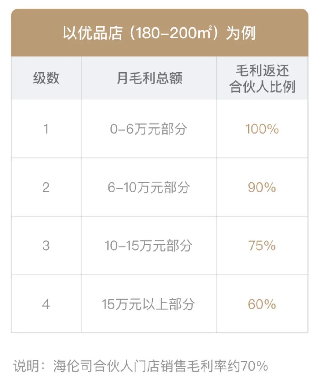 同样以180-200㎡的优品店为例,当月毛利总额在6万元以下,海伦司将100%退还毛利,当毛利总额在6-10万元之间时,海伦司将收取10%的毛利分成;毛利总额在10-15万元之间的,收取25%;当月毛利总额在15万元以上的,海伦司公司将收取40%的毛利。