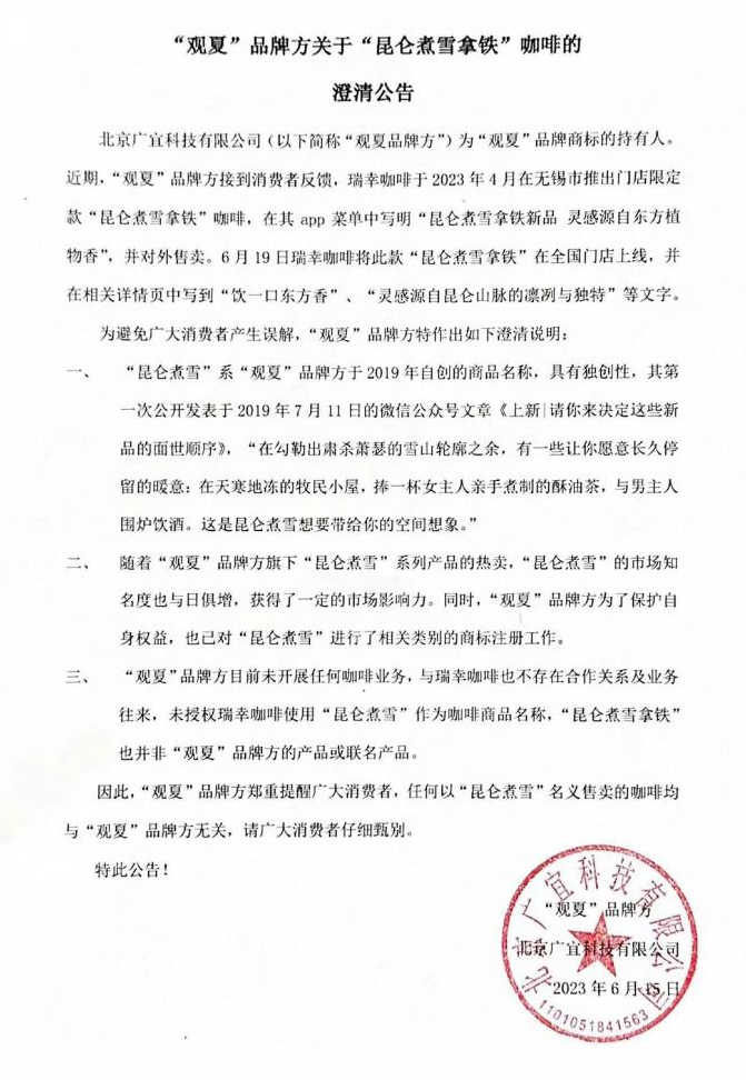 观夏方面认为,品牌旗下“昆仑煮雪”系列名称具有独创性,且产品已经获得了一定的市场影响力,如今瑞幸咖啡新品与其“撞名”,故发布声明提醒消费者,该咖啡产品与观夏品牌方无关。