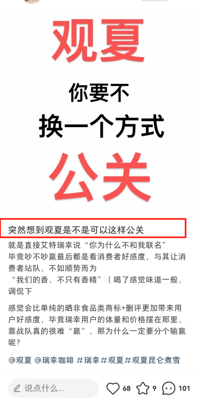 有人进一步指出,这次观夏的公关声明是一个“昏招”。“第一次接触观夏的时候真的一眼爱上,视觉系统超级强大,内容也很好,一直在持续关注,但是这个‘昆仑煮雪’事件很败好感,‘昆仑煮雪’不是观夏第一个造出来的词,还发个声明,估计瑞幸很多受众都不知道这个品牌。”