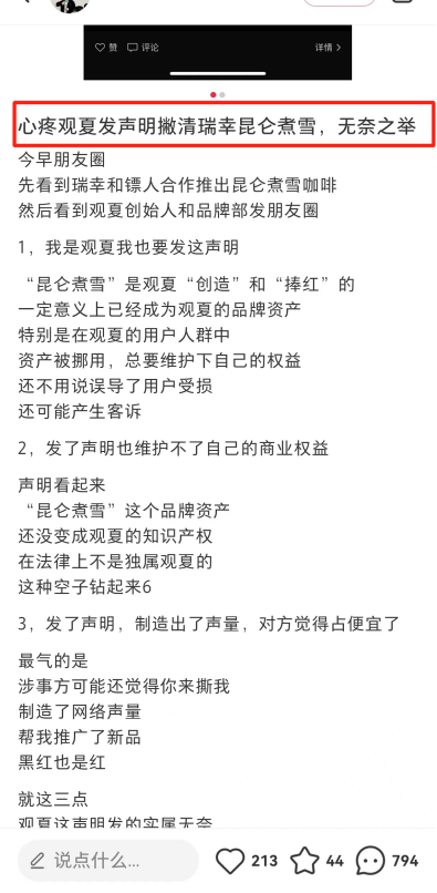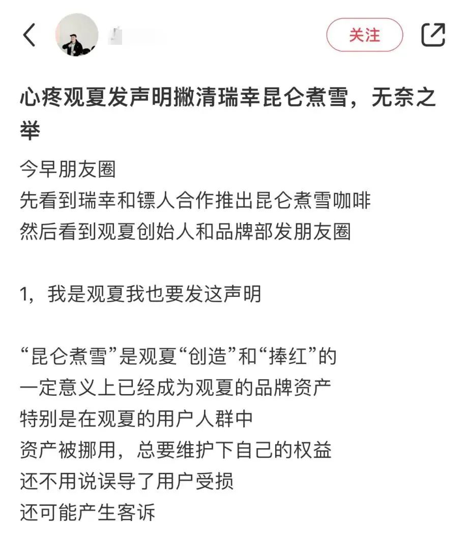 其中支持观夏的消费者认为,“昆仑煮雪”是观夏“创造”和“捧红”的产品,一定意义上已经成为观夏的品牌资产,尤其对于品牌用户人群来说,瑞幸同名产品可能会造成“观夏联名瑞幸”的误导。
